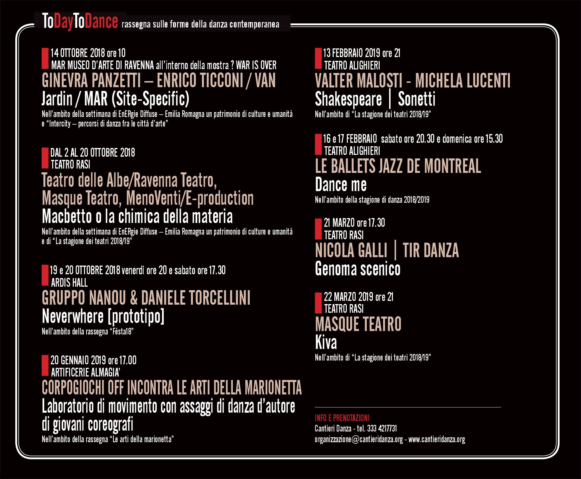 Anche in questa settima edizione di ToDay ToDance è tangibile l’eterogeneità che contraddistingue gli appuntamenti della rassegna: eterogeneità che diventa occasione preziosa di confronto e condivisione non solo tra gli enti promotori della rassegna, ma anche tra i diversi pubblici che vengono a contatto con le proposte artistiche presenti in cartellone – ha affermato Selina Bassini di Cantieri Danza – La grande forza di una rassegna come questa è proprio la capacità di mantenere vivo e costante il dialogo e la sinergia tra gli operatori culturali di Ravenna, proponendo appuntamenti in grado di attrarre non solo il pubblico appassionato alla danza contemporanea, ma anche un pubblico di curiosi, giovanissimi e famiglie.