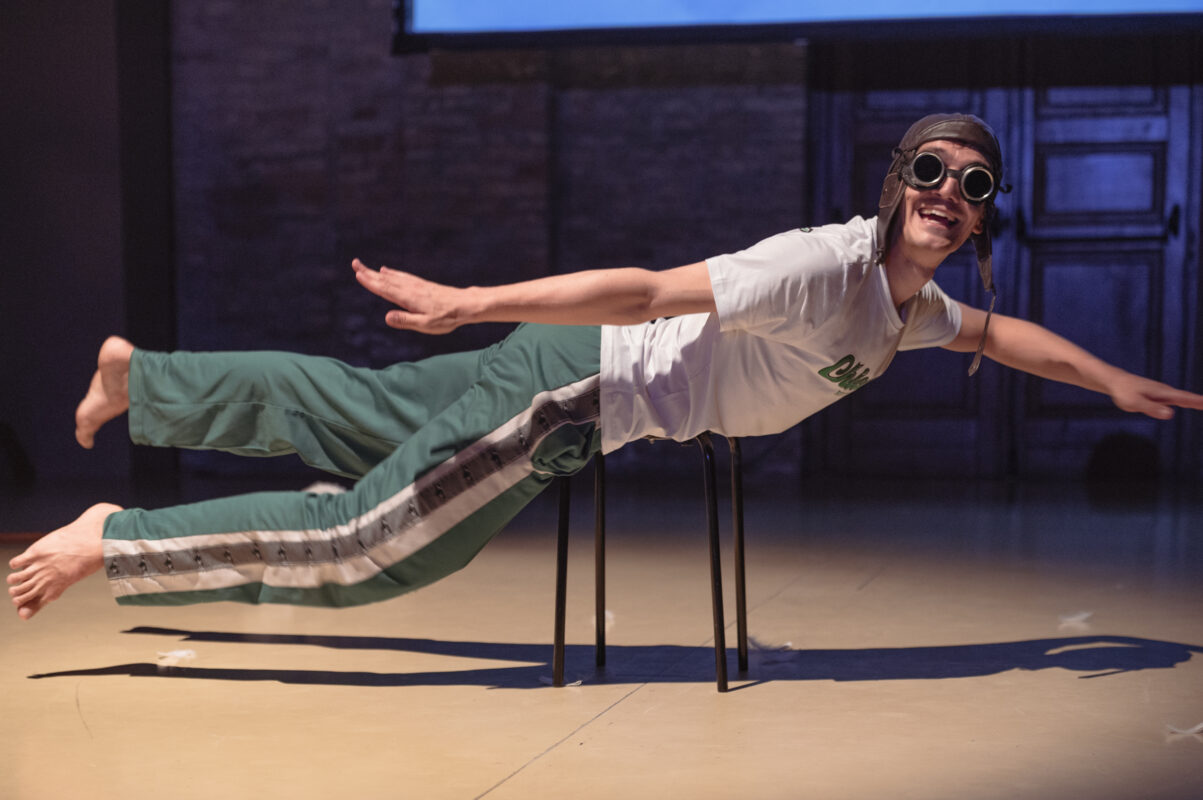 Finalmente un po’ di leggerezza. È proprio quella che ci vuole per provare a volare. Gruppo Ibrido porta in scena la prova aperta di Walt e l’arte di volare, coreografia di e con Davide Tagliavini, all’interno delle Artificerie Almagià. Walt è un ragazzo di 13 anni che, vestito del suo pigiama colorato e avvolto dalla sua coperta, trasporta il pubblico nel suo mondo onirico. Walt sogna di volare, desiderio comune a tutti noi spettatori, adulti e bambini, che seguiamo ben volentieri i suoi tentativi di volo usando sia gli strumenti in scena – a cominciare dalle ali di piume, o il saltarello con il quale il ragazzo prova a darsi spinte verso l’alto – sia proiettandoli su un fondale cinematografico, dove gli eroi di Walt hanno realizzato il loro sogno. Scorrono sullo schermo riferimenti a La storia infinita, a Bastian Balthasar Bux, o ad Harry Potter, che sfreccia sulla scopa volante giocando a quidditch. Non importa che Walt viva in un luogo dove una sorta di “dittatore della città“ – come lo definisce un bambino del pubblico – pretende di vietare ogni forma di svago e di socialità (andare a scuola o mangiare pizza con patatine fritte è vietato); a Walt importa solo la propria perseveranza. Nonostante per tutta la durata della performance Walt rimanga con i piedi per terra importa però che per 20 minuti il pubblico abbia provato quel desiderio di volare con lui. La danza, con i suoi meravigliosi salti – grand jeté – forse potrebbe dare una mano a Walt a volare più in alto: perché la danza lo fa. Speriamo che impari a usarli nei suoi prossimi tentativi e che possa farci volare con lui.