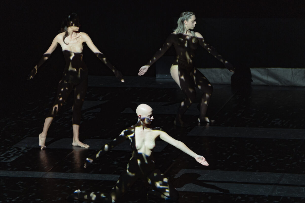Alessandra Cozzi, Elena della Manna ed Eleonora Gambini sono tre figure dai corpi e dalle movenze geroglifiche impegnate in quello che sembrerebbe un arcaico rito di sacrificio umano all’interno di un matrix. Una sovrapposizione tra codici antichi e moderni che condividono il corpo come punto di partenza. Resta impresso l’uso delle luci di scena di rimando all’ immaginario cyberfemminista. Luci che sovrascrivono l’identità della performance accostando le nuove gerarchie funzionali e tecnologiche alle antiche piramidi sociali, per esplorare il tema dell’intersezionalità nella molteplicità delle forme.