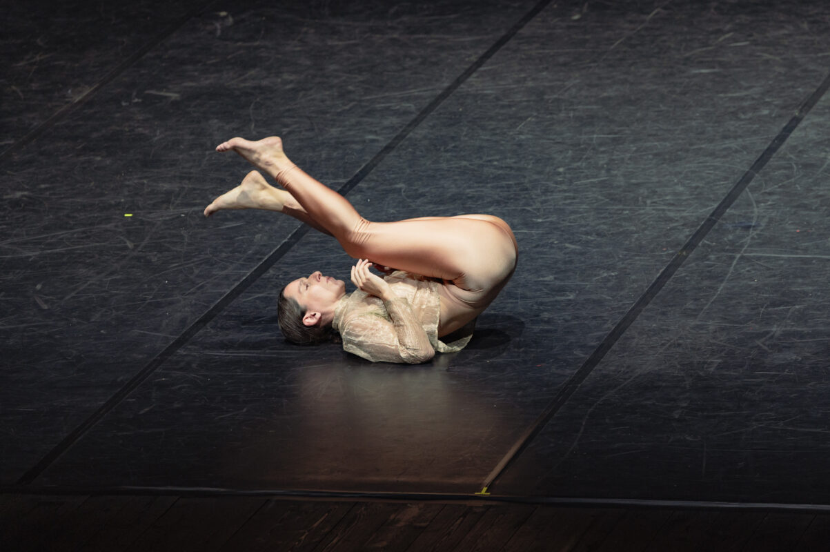 Due momenti scandiscono l’azione scenica. Il primo, diurno, con la scena nuda schiarita da un immobile piazzato di luce fredda. Sul palcoscenico sbucano da sinistra la schiena vestita d’organza dorata e la testa con la treccia della performer; mentre le gambe sono ancora nascoste dietro le quinte. Da questa posizione, Secondari srotola la colonna vertebrale sul pavimento e vi si adagia con le braccia che vanno verso l’alto: l’energia passa prima dagli omeri, attraversando il gomito, l’ulna e il radio e così via, fino ad arrivare a falangine e falangette, le quali, ora, dopo alcuni istanti, dondolano lentamente, come nel risveglio da un intorpidimento. Si stabilisce qui la dinamica: Secondari si sposta nello spazio, si stringe le guance con i polpastrelli mentre, condotto tutto il braccio dietro la schiena, lo fa uscire dall’altra parte e schiocca le dita. Oppure si slega i capelli accovacciata, nascondendo il viso e permettendo, in una quasi perenne moviola, di ammirarne il volume, come se non fossero i suoi, ma quelli di qualcun altro, di una bambola. L’atmosfera cambia con il crepuscolo: ora si fa buio e timidi fari illuminano a mala pena la scena da dietro una delle quinte e dal retropalco oltre il fondale, che Secondari ha scostato, permettendo l’afflusso del bagliore. In questo nuovo panorama, viene riproposto ancora il gioco di immagini innescate dall’interno, ma fatte per essere guardate da fuori, al quale si è ormai abituati. Una variazione, invece, è data nell’interazione con gli oggetti che ora compaiono in scena; come nel caso di quella pallina che, rimbalzando davanti alla performer, la costringe, nell’intento di recuperarla, a lasciare l’oscurità ed essere toccata dai tagli di luce, formalizzanti un palcoscenico costruito solo di assenze. Brusii, ticchettii, silenzi mancati a firma di Nicola Ratti sono una guida sonora in questo viaggio a doppia velocità: quella di Achille e quella della tartaruga – rispettivamente simbolo della velocità alla quale guarda il pubblico e di quella con la quale la performer vive le proprie azioni dall’interno. Eppure, in conclusione, i due personaggi del paradosso, fulmine e lumaca, si ritrovano nello stesso punto, dove la performer si inchina davanti al pubblico del Teatro Rasi che la applaude, forse non abbastanza intensamente.